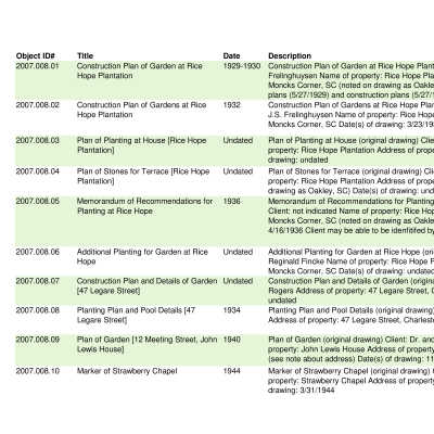 Lists of LB drawings (and possibly other papers) that are at the SC Historical Society. Includes a 90+ page typed list, presumably generated by SCHS; a spreadsheet of Charleston garden plans at SCHS, presumably generated by HCF as part of the Survey; and an inventory of "Briggs Papers" at SCHS created by John David Utterback, who worked with LB and donated the drawings to SCHS in 1983. (Note, see Multimedia Link in this record for the latter two lists; they are searchable.)Container