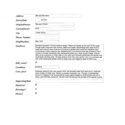 Most files contain the survey form, house and/or garden history, and a copy of the landscape drawing/plan. Completed surveys are done for these properties: Gardens surveyed: 72 Anson Street, 8 Bedon's Alley, 7 Church Street, 15 Church Street, 19 Church Street (Briggs style but not Briggs designed), 39 Church Street, 58 Church Street, 59 Church Street, 39 East Bay Street, 83 East Bay Street, 2 King Street, 37 King Street, 8 Meeting Street, 23 Meeting Street, 34 Meeting Street, 64 South Battery, 100 Tradd Street, 122 Tradd Street, and McLeod Plantation.Notes