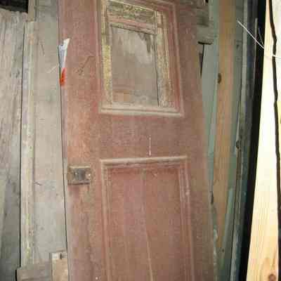Louvered window, reddish brown paint. 73.5"H x 24"W. Top broken. Bottom panel is split.Collection