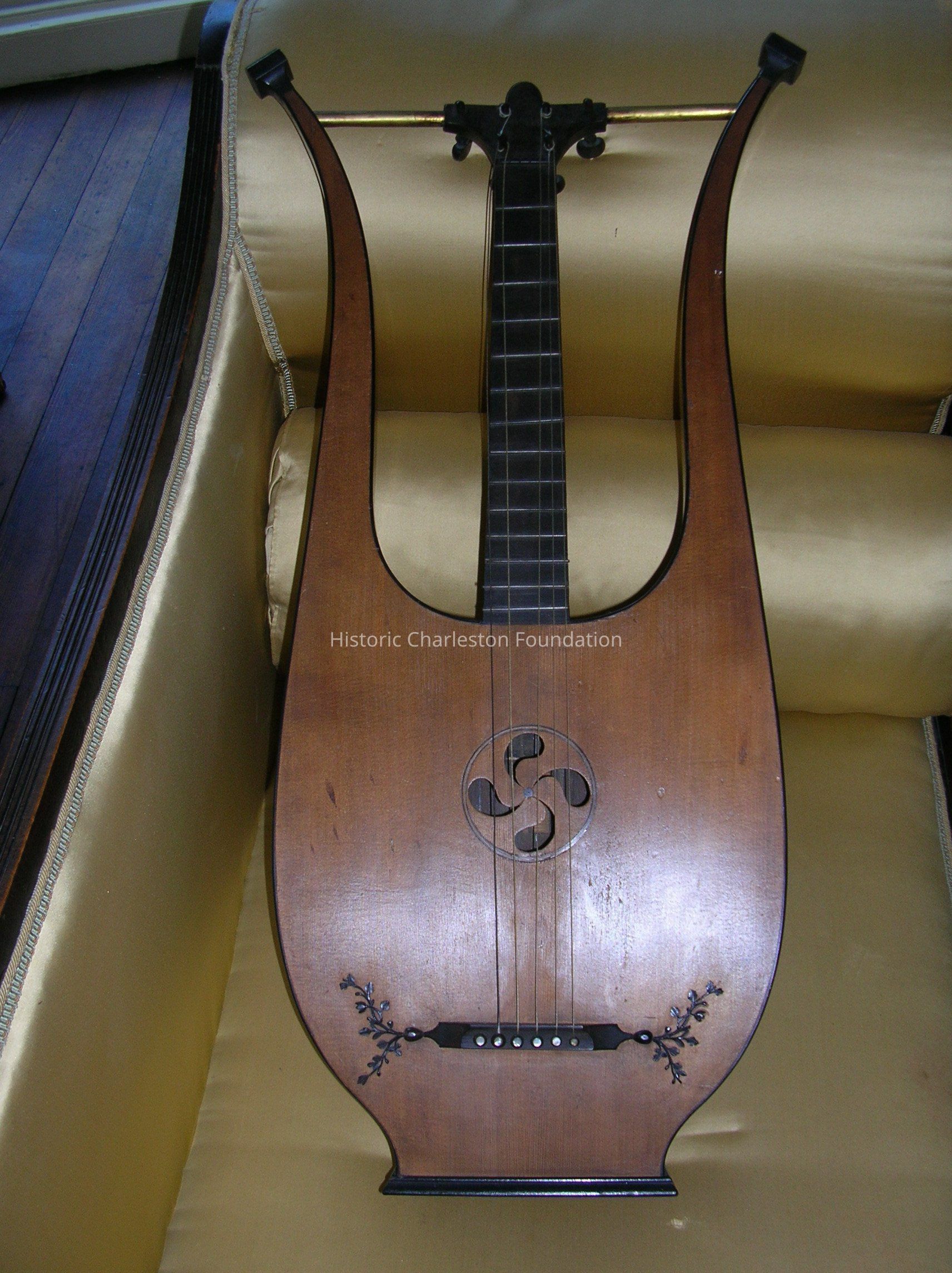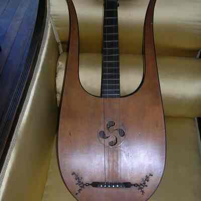 Lyre with six strings, each with adjustment screw on back. Light wood front and dark wood back. Each string end button is inlaid with mother of pearl. Case is coffin-shaped wooden box with iron hinges, lock plate, and handle.Collection