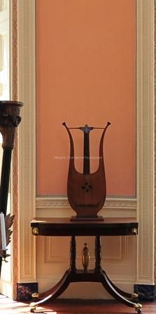 Lyre with six strings, each with adjustment screw on back. Light wood front and dark wood back. Each string end button is inlaid with mother of pearl.