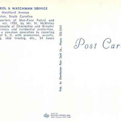 Captioned on back: "This is the headquarters of Mac-Pace Patrol & Watchman Service, est. 1950, by Mr. H. McKinley Pace to serve the people of Charleston and Greater Charleston with business and residential protection. It has grown from a one-man operation to covering most of the state of S.C. with protection, escorts, employee screening, skip tracing, etc., 24 hours per day."Collection