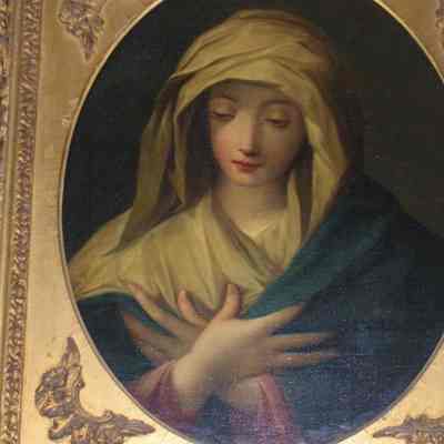 Oil on Canvas of Madonna on Rectangular Canvas Setinto Oval of Carved Adn Molded Gilt Frame. Subject with Hands Crossed Over Breast, Wearing White Hood and Blue Cloak. Eyes in Downward Gaze. Similar To a Work in the National Gallery, London By Sassaferrato.