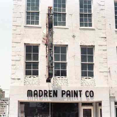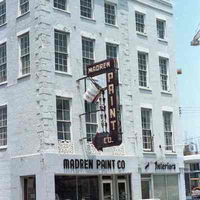 Eight color negatives featuring various views of the Madren Paint Company Building (177-179 Meeting Street) and vicinity: