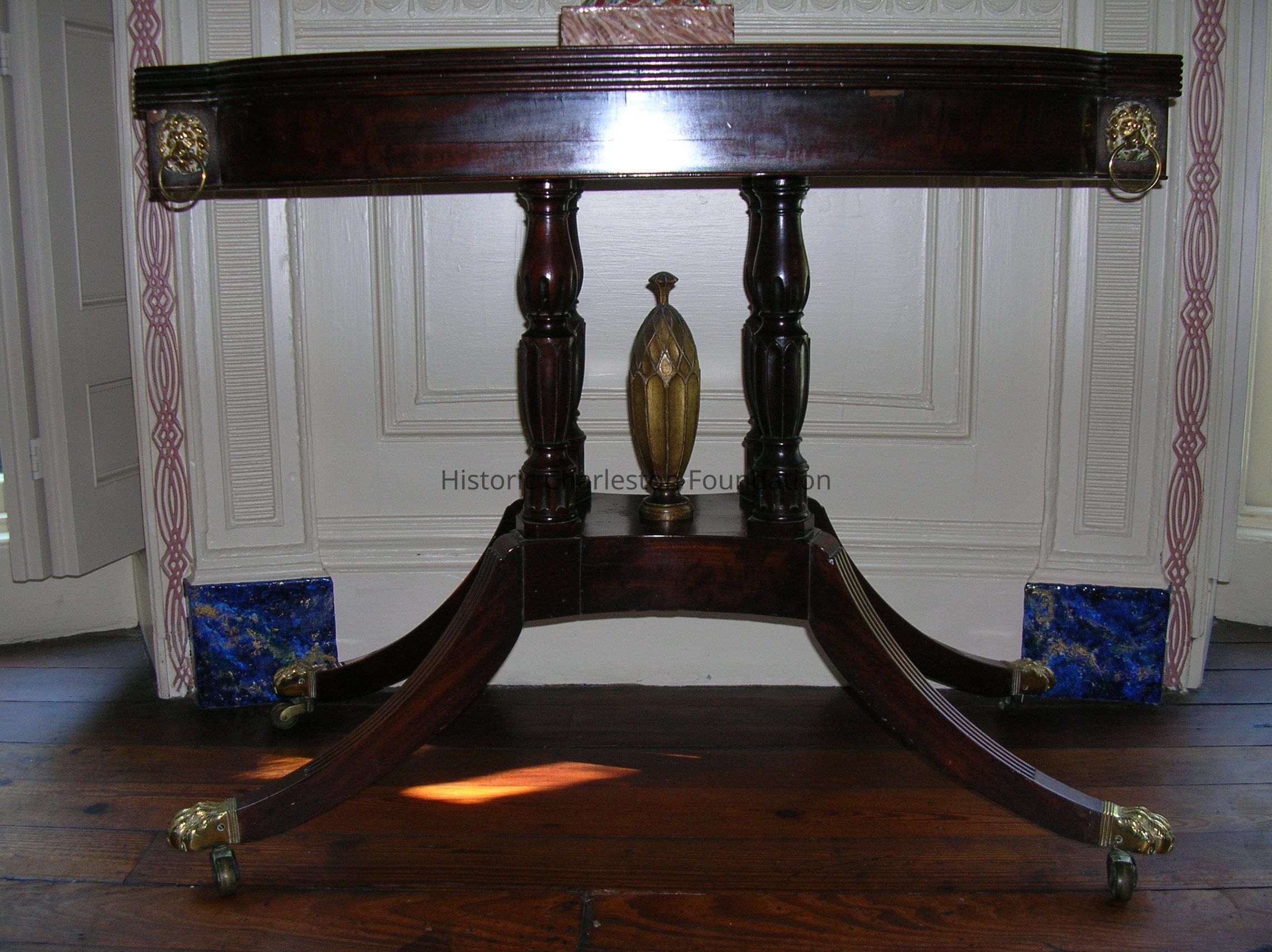 11/10/04: This table is well balanced on a wide-spreading pedestal basewith rectangular base supporting four columns embellished with fluting and stylized leaf carving. At the center of the base rests a gilded, attenuated pineapple. The four reeded legs terminate in brass lions' paw feet on casters. The top is square when open with ovolo corners. The front apron has lion-head and ring brass mounts at each corner.