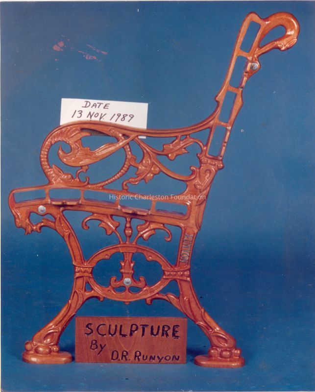 Photograph of a mahogany sculpture of a park bench that was used as the pattern for many park benches throughout Charleston, including Waterfront Park, various bus stops, the Charleston Visitors Center, various parking garages, Wragg Square, etc. Many of those benches bear the artist's name "Runyon." The design consists of gargoyles capturing birds of paradise and other ornamentation, and was based on a ca. 1880 "Little Charleston Bench" a/k/a "Battery Bench."