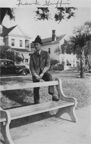 B&W photograph (scan) of a man standing behind a park bench at Colonial Lake. Two Rutledge Avenue houses are in the background.Collection