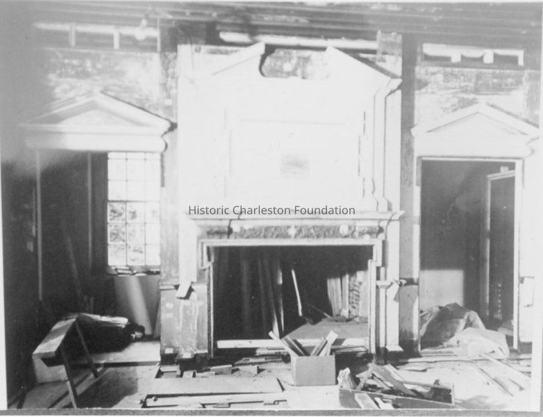 B&W photograph of an interior room of the Mansion House (71 Broad Street) in a state of what appears to be demolition. Features a fireplace and overmantel and two pedimented doorways on either side. Debris on the floor in front. Likely a reprint of the original. Two copies of photo in sleeve.Collection