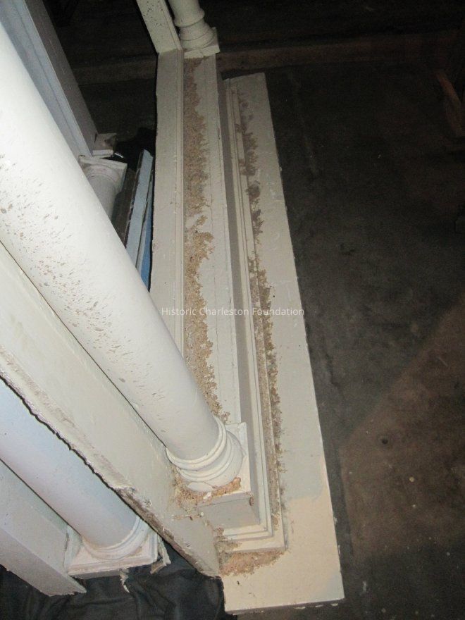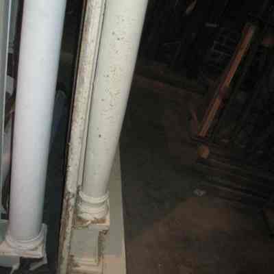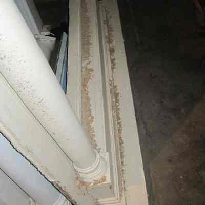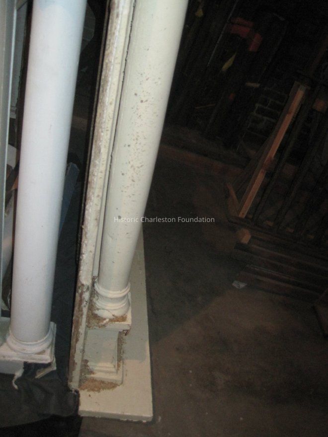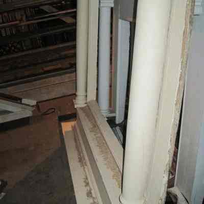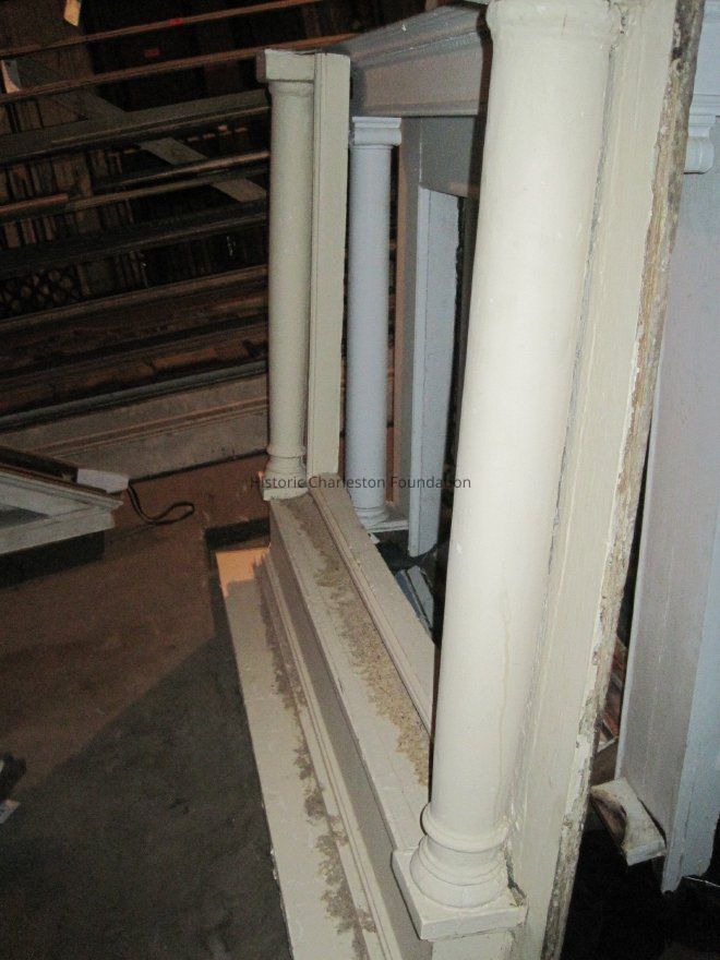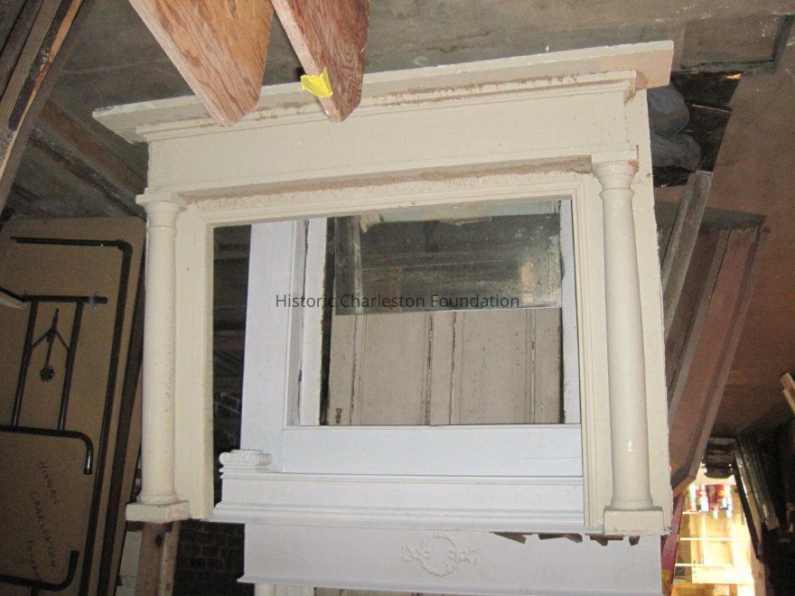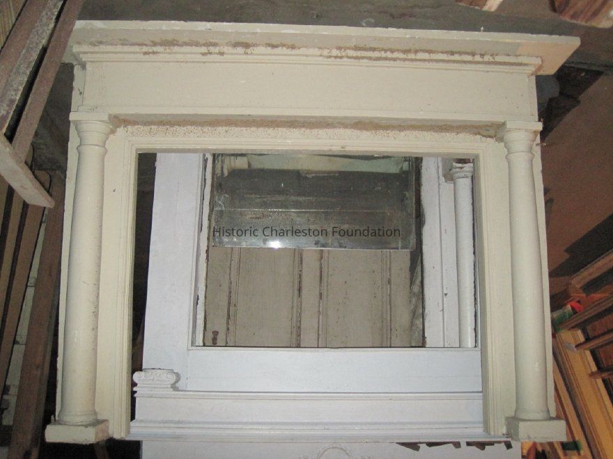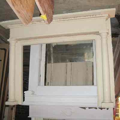 Wooden mantel painted in a cream/beige color. Void of decorative detail except for colonettes flanking each side beneath a simple frieze. Currently positioned upside down on first floor adjacent to the elevator. From 74 Church Street.