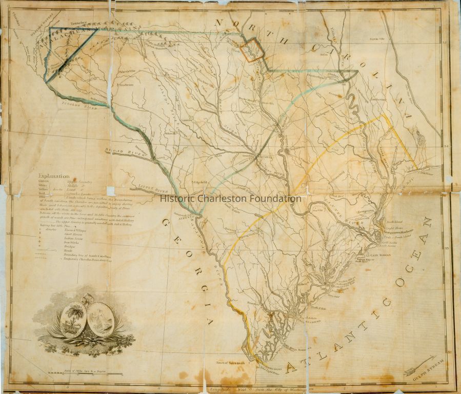 Map of South Carolina including Charleston by T. Coram, 1802. Blue, green, yellow, and red ink were used in the explanation. Colors have now faded.Collection