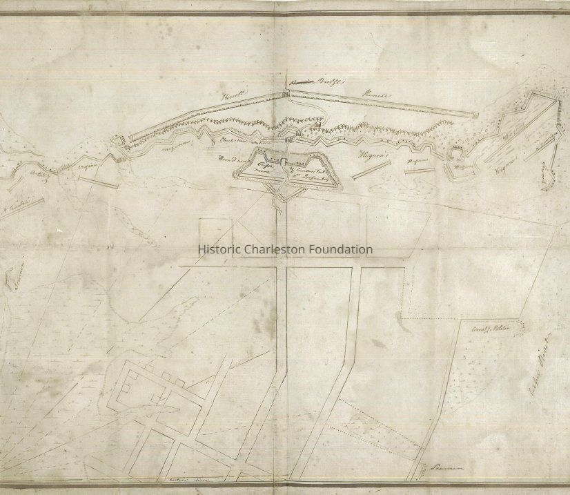 Reproduction of a map done by a volunteer with the American forces showing the American defenses during the Siege of Charleston in 1780. Distinguishing feature is the "horn work" at the upper center of the map.