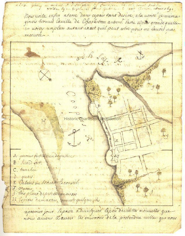 Copy of map of hand-drawn map of Charles Towne, by Jean Boyd. Possibly the one of the earliest known maps of Charles Towne.