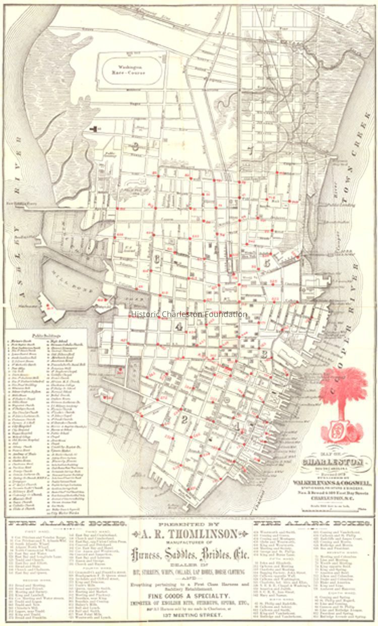 Map of Charleston (peninsula), revised in 1879, and published by Walker, Evans & Cogswell, Stationers, Printers & Binders, located at nos. 3 Broad and 109 East Bay Streets. Scale 900' = 1". Features locations of Fire Alarm Boxes (indicated in red numbering), and public buildings, with indexes to same.