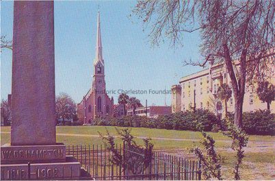 Marion Square with Wade Hampton monument in the foreground and St. Matthews Lutheran Church, "new library" (King Street), and the old Citadel in the background (color photographic print).Collection