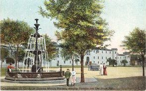 Postcard (scan) featuring the fountain on the grounds on the public mall now known as Marion Square, formerly known as the parade grounds for the SC Military Academy (Old Citadel). The "Old Citadel" and the Old Hornwork fragment appear in the background.Collection