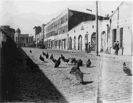 Photo is identified as Market Street north. Several buzzards stand in the middle of the street. A portion of the Charleston Ice Company building may be seen on the right, and Enterprise Bank (191 Meeting Street) is visible in the background.Collection