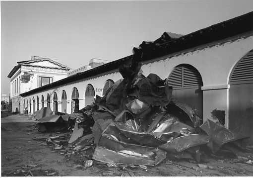 B&W photograph of Central Market Street sheds showing the damage done by Hurricane Hugo. Rear of Market Hall in background. Dated October 4, 1989.Collection
