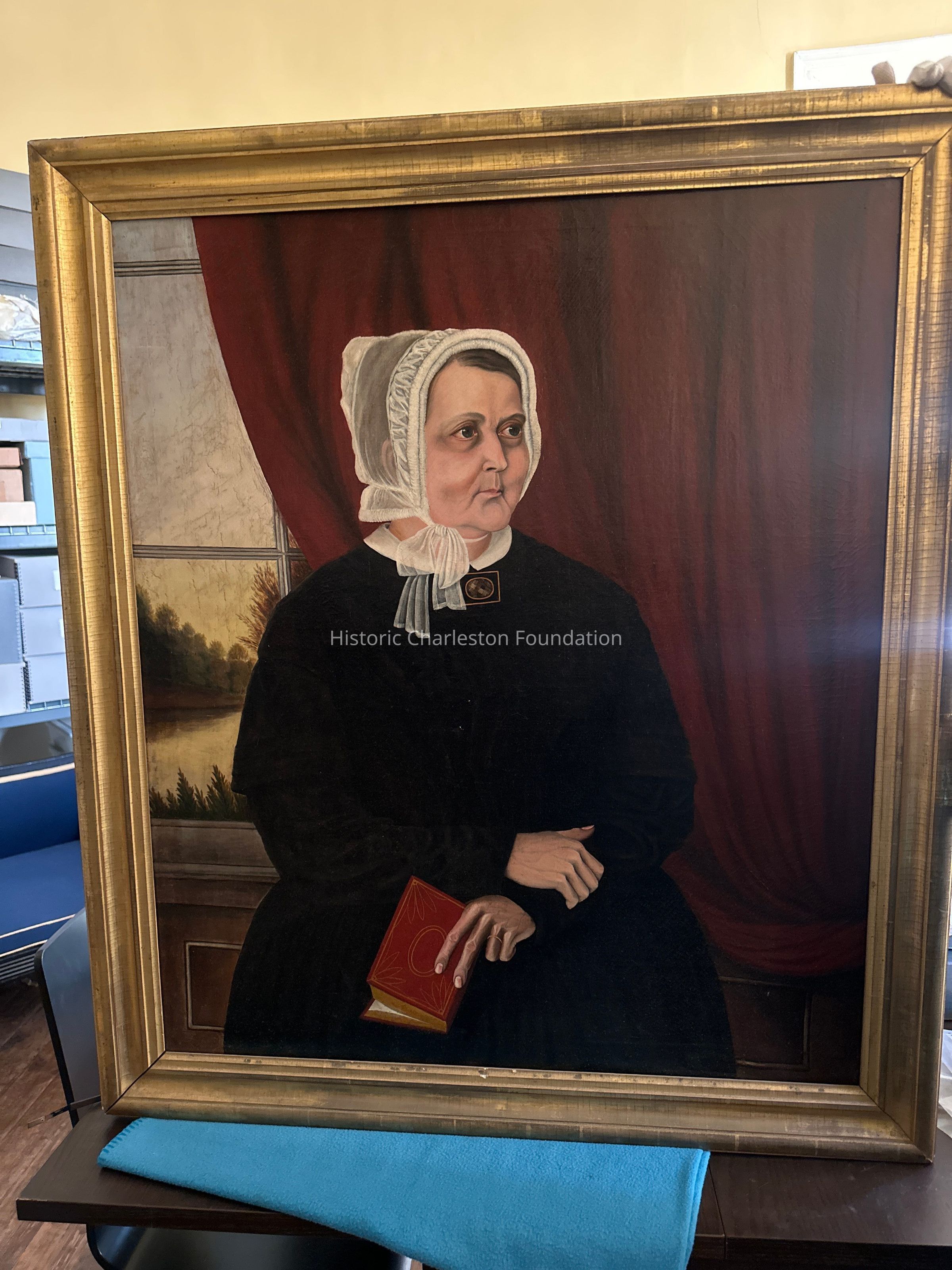 depicting elderly woman at center canvas in black dress with white collar and rectangular black and gold brooch with oval opening displaying woven hair. White cap tied under chin. Left hand with gold wedding band holds red and gilt bound book. Modern paper label applied to reverse reads: "Mrs. Mary Middleton Drayton Age 61 October 31, 1854, canvas mark prepared by Charles Roberson, 51 Long acre, London". In molded frame painted gold.Collection