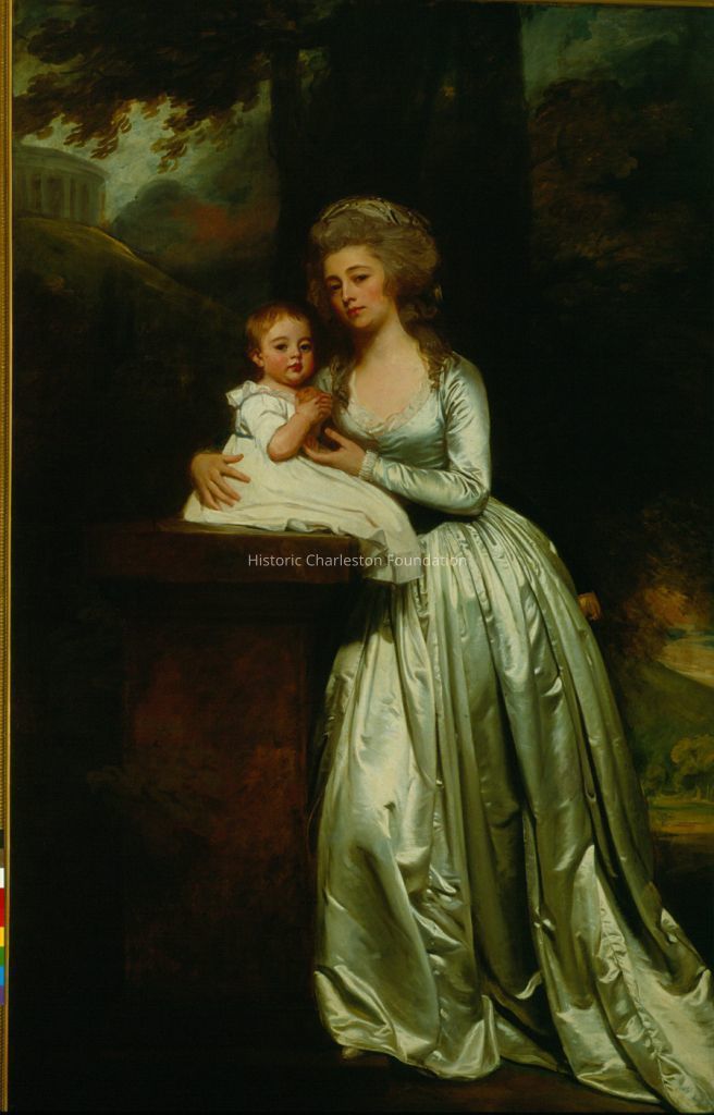 Full Length Portrait of Mary Rutledge Smith, Sister of John Rutledge First Gov (President) of SC and Edward Rutledge, Signer of the Declaration of Independence, and Wife of Colonel Roger Smith. By George Romney, Painted Between Jan and May 1786 At a Cost of 104 Pounds, 18. Shown Standing with Her Right Arm Around a Baby (Probably Edward Nutt Smith) Born in England in 1785, the 12th of 13 Children. the Child Is Sitting on a Pedestal Holding an Orange. Typical Temple/Folly in the Background.
