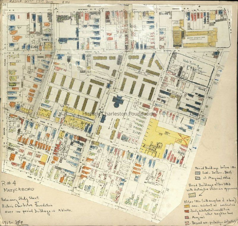 Copy of a Sanborn Map hand-colored and annotated for use by Historic Charleston Foundation to study a residential area in the western part of Mazyckborough (area bounded by Wentworth Street, St. Philip Street, Archdale Street, Broad Street, and Rutledge Avenue).