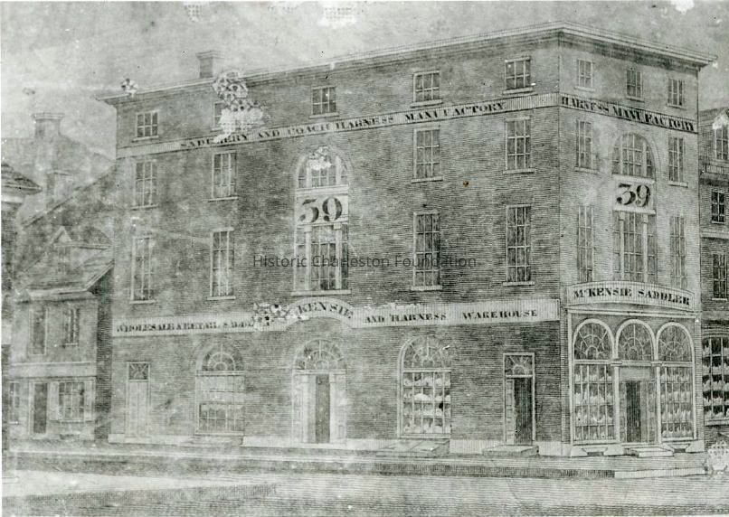 Photographic reprint of an engraved illustration of McKensie Saddler / Saddlery and Coach Harness Manufactory. The location of the building has not been confirmed. The actual engraving* has "No. 135 Church Street Charleston" at the bottom; however, the 1852 City Directory lists them at the corner of Church and Chalmers Streets. The number "39" is painted prominently on both the east and north facades. The building directly to the south is present and may provide a key to determining the location of the building, now obviously gone.