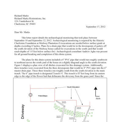 Six files contain documentation of the easement on the property including related correspondence and Confirmation of Understanding; Part I certification application (National Register); documentation related to the Medway Environmental Trust (Medway Historic Fund) and the Medway Program in Arts and Letters; annual inspection reports, requests for alterations, and correspondence related to the management of the property; paint sample (undated, unattributed); correspondence related to conducting archaeological investigations including Agreement; "Background History of Medway" (Medway Environmental Trust); "Medway Plantation" by Gertrude S. Legendre (1970); "Preserving the Legacy: Medway Plantation on Back River" by Richard Cote; "Medway Plantation, 1686-1980" by Gertrude S. Legendre (1980); excerpts from publications including Charleston Gardens, Plantations of the Carolina Lowcountry (includes architectural drawing), and Historic Ramblin's Through Berkeley; research report on log construction (HCF intern?, ca. 2017); "Landscape and Architectural Documentation" (ICOMOS and HCF interns, 2012) (separate folder); newspaper articles (including DYKYC, 1981); photocopies of plats and maps; history of Pine Grove Plantation (formerly Back River Plantation); Abstract of title for Pine Grove Plantation/Back River Plantation; archaeological reports of Medway Plantation, septic field, main house, Pine Grove, and Cainhoy Pottery Site (Carl Steen) and related correspondence, including SCDAH grant application and "Historical Archaeology at Medway Plantation"; letters from Gertrude S. Legendre related to issues with nearby military installations; documentation related to the Medway Environmental Trust (Medway Historic Fund).