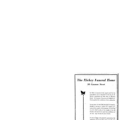 Photograph (scan) of an advertisement for The Mickey Funeral Home at 50 Cannon Street, including a B&W photograph of the building, street (front) elevation. Original source: "Simms' Blue Book and National Negro Business and Professional Directory" by James N. Simms, compiler and publisher, 1923.