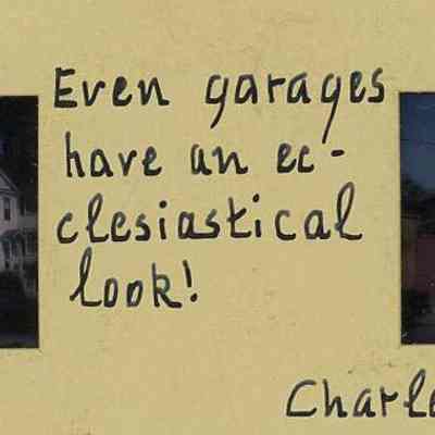 25: Captioned: "Even garages have an ecclesiastical look!"