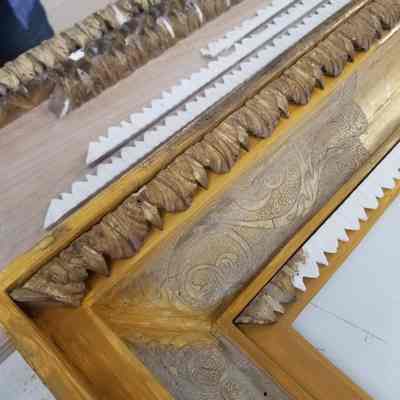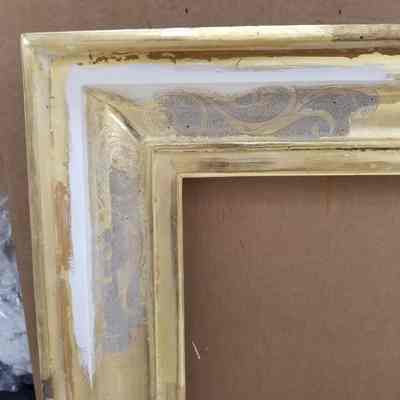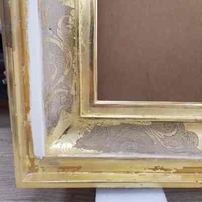 Attached are corner details of the Rosa frame where our master carver is recreating the areas of lost punchwork in the gesso. Our finishing team has been working alongside him doing gesso and patch gilding. They were able to retain large portions of the original gilding, but this requires extra caution when handling. (email from Emma Cotter, 4/5/23 to Valerie Perry)