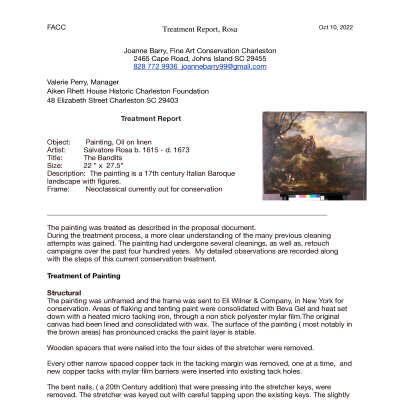 Scope of work: The painting will be photographed to document its condition before, during, and after treatment with 35mm color slide and black & white photography. Areas of loose of flaking paint will be consolidated using an appropriate adhesive. The surface grime will be romoved and the varnish layer reduced using organic solvents that are safe for the paint layer. The debris will be dislodgd between the stretcher bars and canvas and the reverse of hte painting will be vacuumed. The stretcher bars will be wiped with a damp cloth to remove andy dust and grime. The painting will be keyed out. An isolating varnish of MS2A or Acryloid B-72 resin will be brush applied ot the painting. Areas of ground an paint loss will be filled with gesso. Losses and abrasions will be inpainted using Golden MSA and Lefranc& Bourgeois pigments to match the surrounding areas of loss. A final spray coat varnish of Acryloid B-72 will be applied ot the painting. The rabbet of the frame will be lined with black felt to protect the front of the painting with direct abrasion from the rabbet of the frame. A protective backing board will be attached to the reverse of the stretcher with washers and screws. The painting will be installed in its frame with metal plates. New hanging hardware and wire will be attaced to the reverse of the frame.