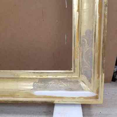 Frame: Wood, rectangular, box like, gilded. Plaster moldings. Near outer edge is a row of acanthus leaves and dart molding. Inner edge has a row of canlis leaves and dart molding. In the center a cavetto mold is decorated with a cauli culus design over a bed of stippling.