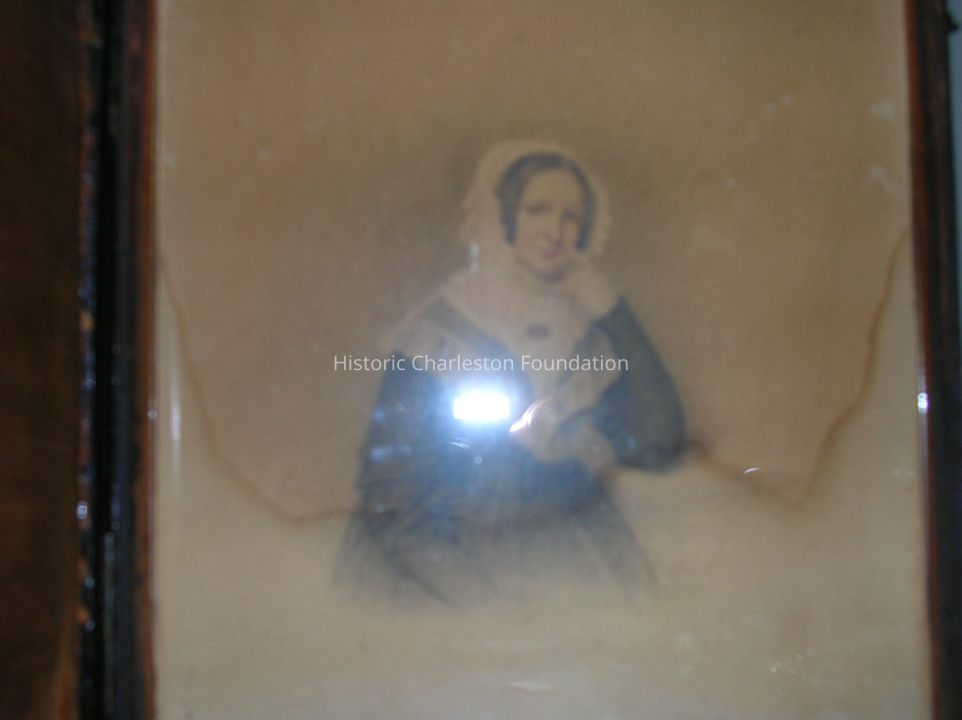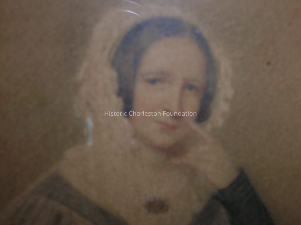 Pencil Minature of Sarah Russell Dehon in Middle Age, Wearing Grey Dress with White Collar and White Linen Cap. Seated with Chin Resting on Her Hand. By Anne Izard Mceuen C.1830.Collection