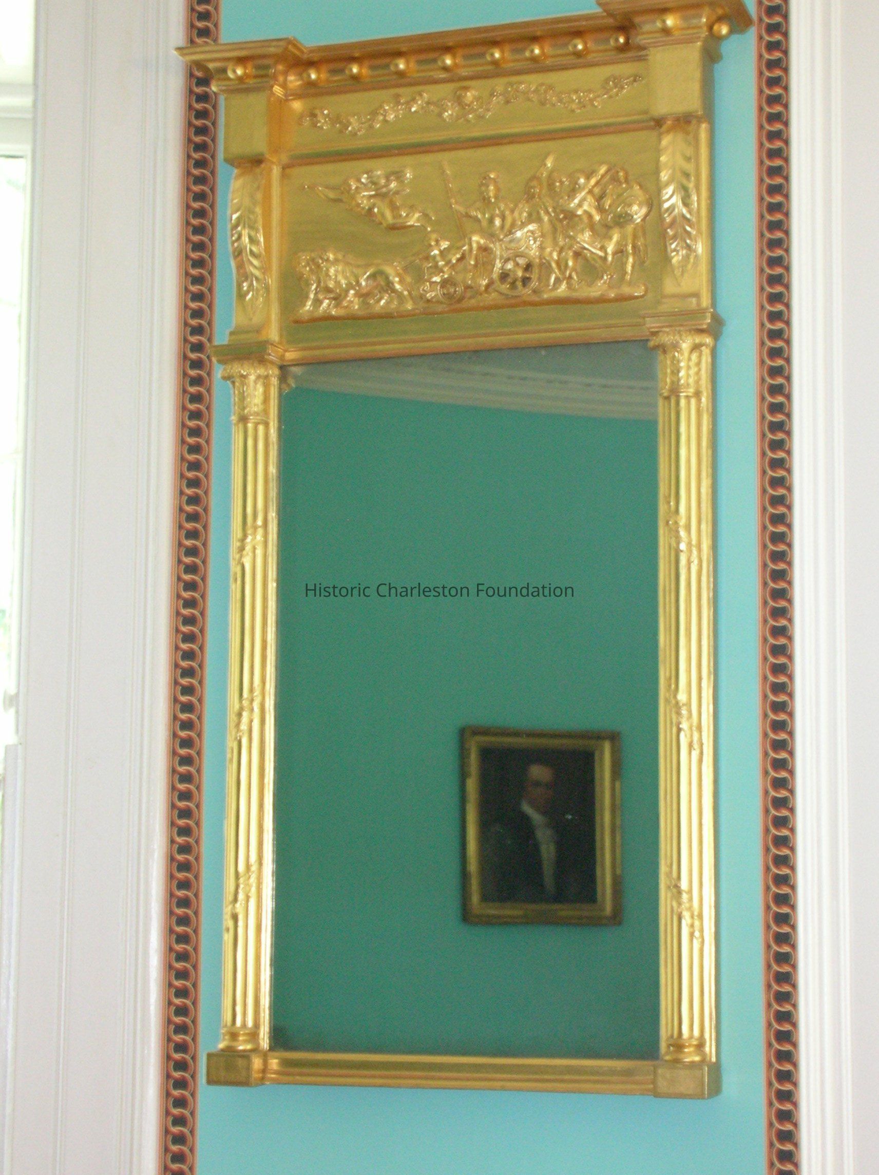 Classical Giltwood Wall Mirror, c.1810. The tablet depicts a chariot drawn by lions and a winged angel above a mirror plate flanked by acanthus brackets and garland draped reeded columns with waterleaf capitals.Collection