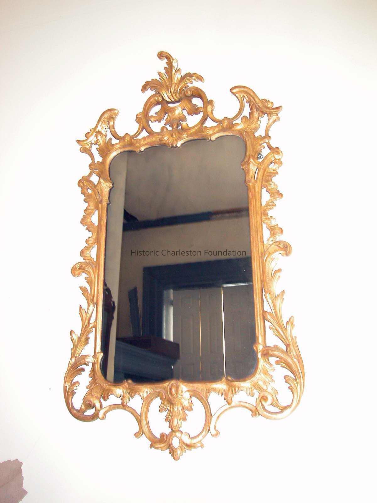 The structure of both mirrors is generally sound except for a few areas of delaminating wood which forms the decorative elements. These areas of delamination include the lower PR and upper PL corner elements on the left side mirror, and the upper PL and PR corners on the right side mirror, as well as some areas of more minor delamination on both frames. The gilded surface is not the original, and is lifting and flaking off down to the wood in areas. The mirrors show some signs of cloudiness and delamination of the silvering, but are generally in good condition. They appear to be the originals as do the back boards. The hanging mechanisms are in good condition and do not require replacement at this time.General Notes