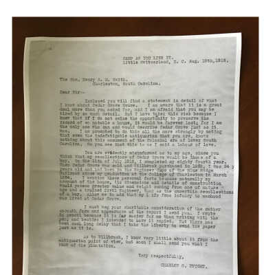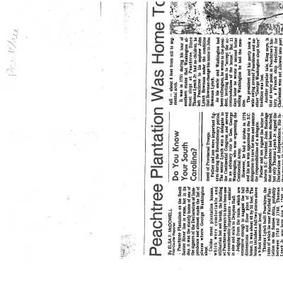 Files may contain a variety of information including newspaper articles; narrative histories; research notes; photos; plats and maps; etc. See Related tab for books about plantations. See also Cooper River Historic District box and individual files/boxes for plantations on which HCF holds an easement: Auldbrass Plantation, Chicora Wood, Lowndes Grove, McLeod Plantation, Medway, Annandale/Millbrook Plantation, Mulberry Plantation, William Seabrook House (Secessionville).Collection