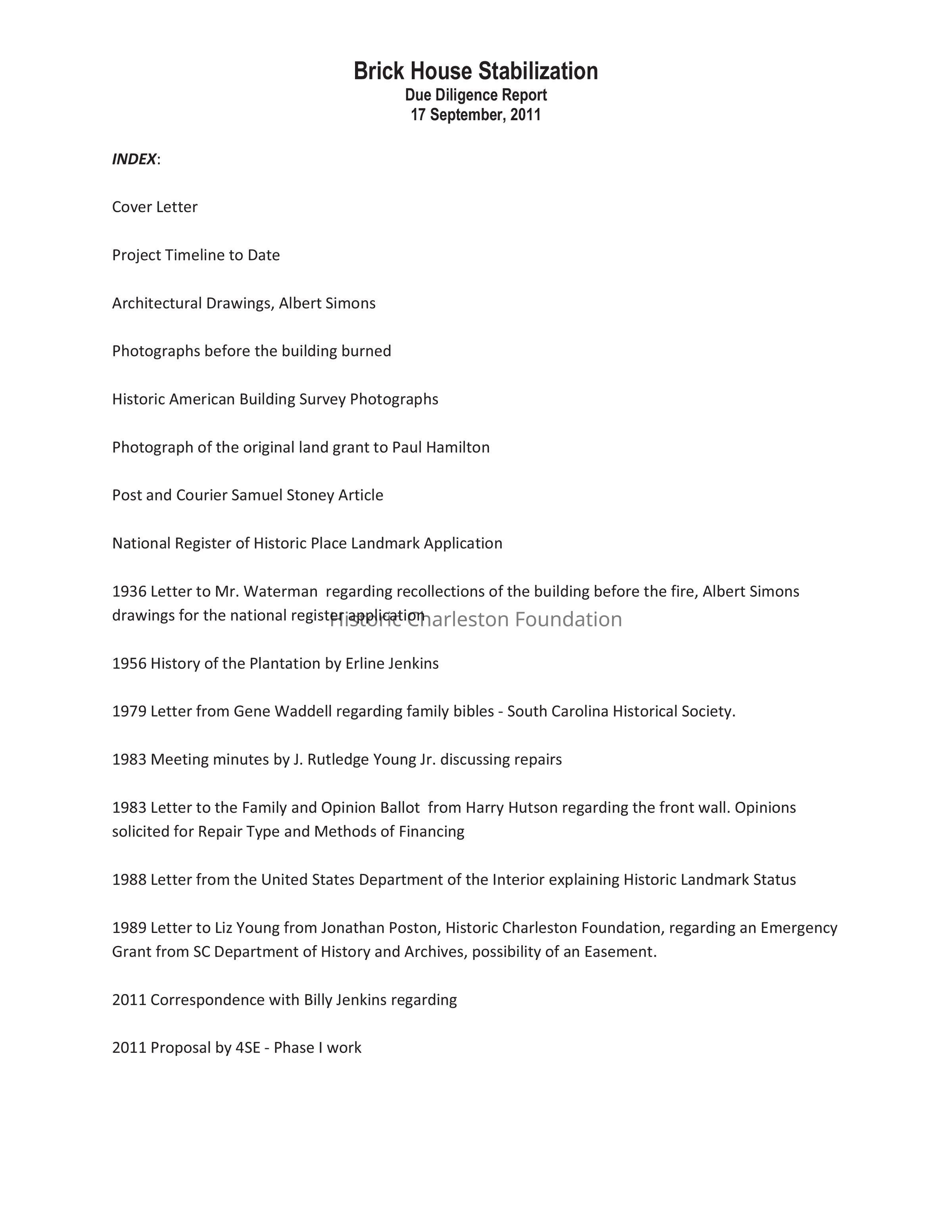 See Media tab for pdf of Brick House Plantation "Stabilization Report."