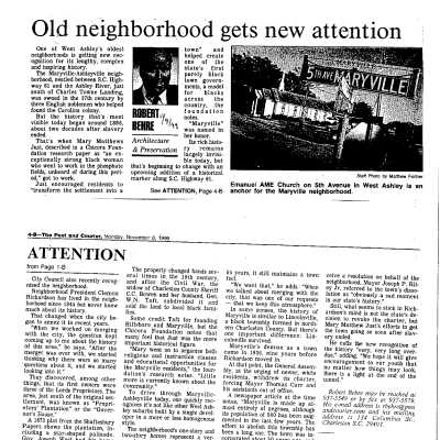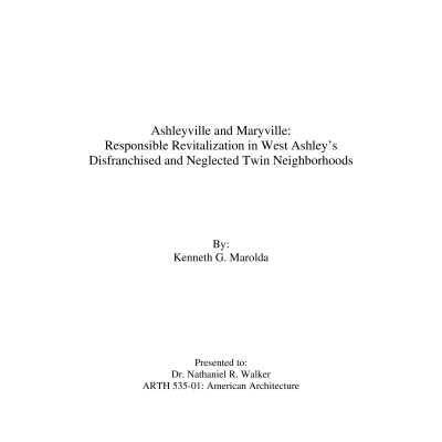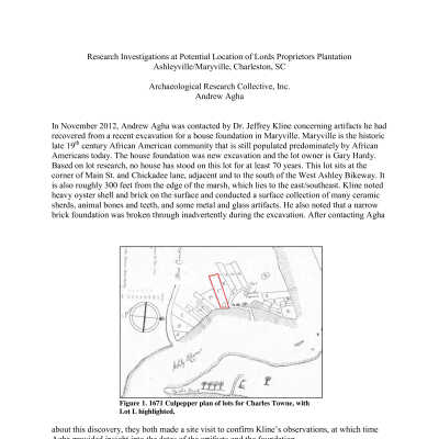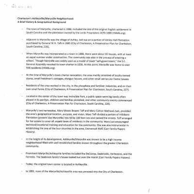 Includes newspaper article "A Bit on Maryville" (West Of, n.d.); thesis "Maryville, South Carolina: An All-Black Town and its White Neighbors (Allen Carrington Hutcheson, 1995); two graduate student reports "Maryville: From the Past Into the Future" and "Ashleyville and Maryville: Responsible Revitalization in West Ashley's Disenfranchised and Neglected Twin Cities" (Kenneth G. Marolda, 2018); archaeological report "Research Investigations at Potential Location of Lords Proprietors Plantation, Ashleyville/Maryville" (Andrew Agha, ca. 2012); report "The Dissolution of the town of Maryville and the Construction of St. Andrew's Boulevard (Kenneth G. Marolda, 2019); print-out of a presentation on Maryville by Meadors (2016).Container