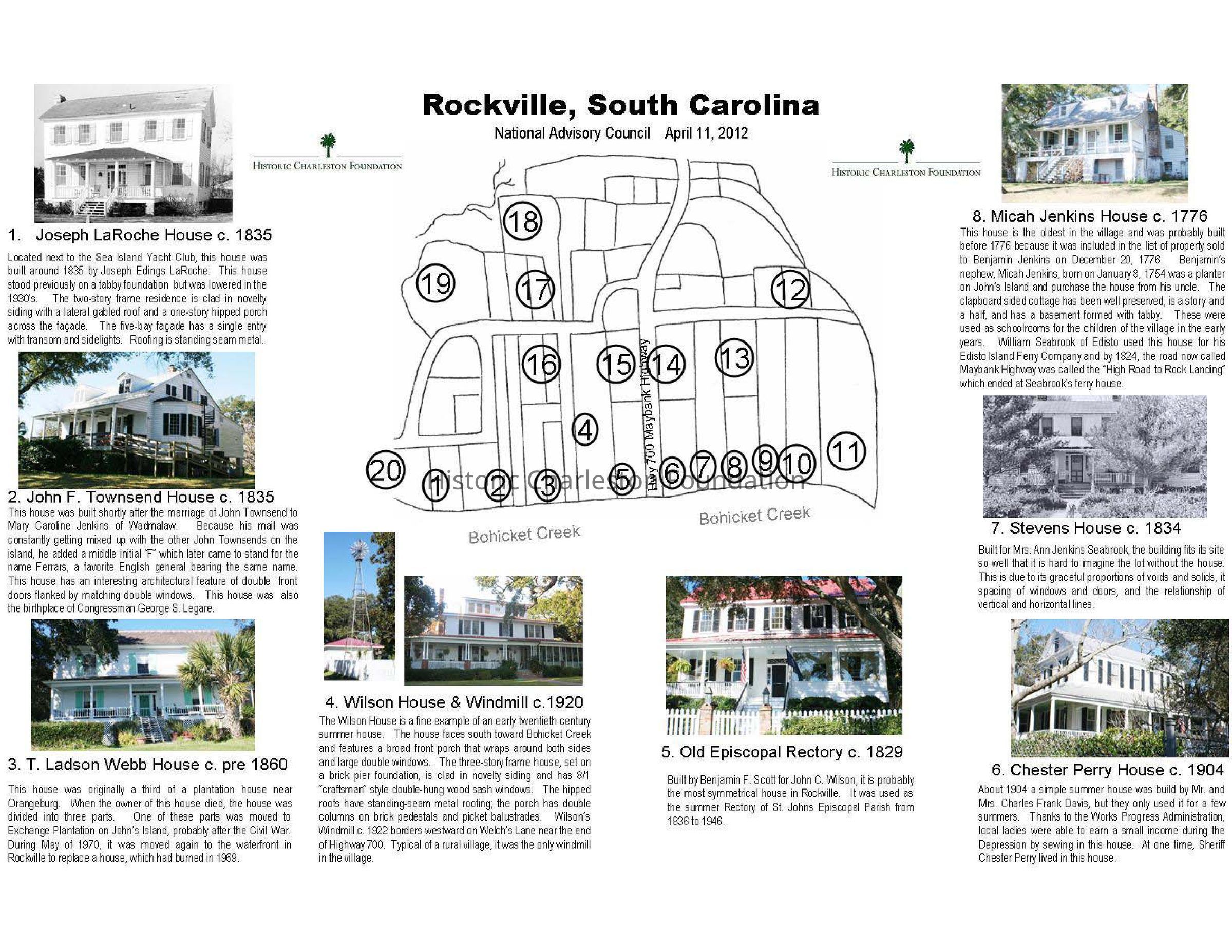 Rockville file includes photocopy of unpublished 1928 Sanborn Fire Insurance Map; HCF Rockville tour map (map and photos/descriptions of historic houses); Village of Rockville Historic District National Register nomination form; Rockville Presbyterian Church National Register nomination form; booklet "Rockville Presbyterian Church: the Early 1700s-1975" (Annie Jenkins Batson, 1976); contents of a resident's historical research including photocopy of paper about Rockville presented by Sophie Seabrook Jenkins (published and typed versions); magazine article "A Treasured Place" (SC Wildlife magazine, 1996);Container