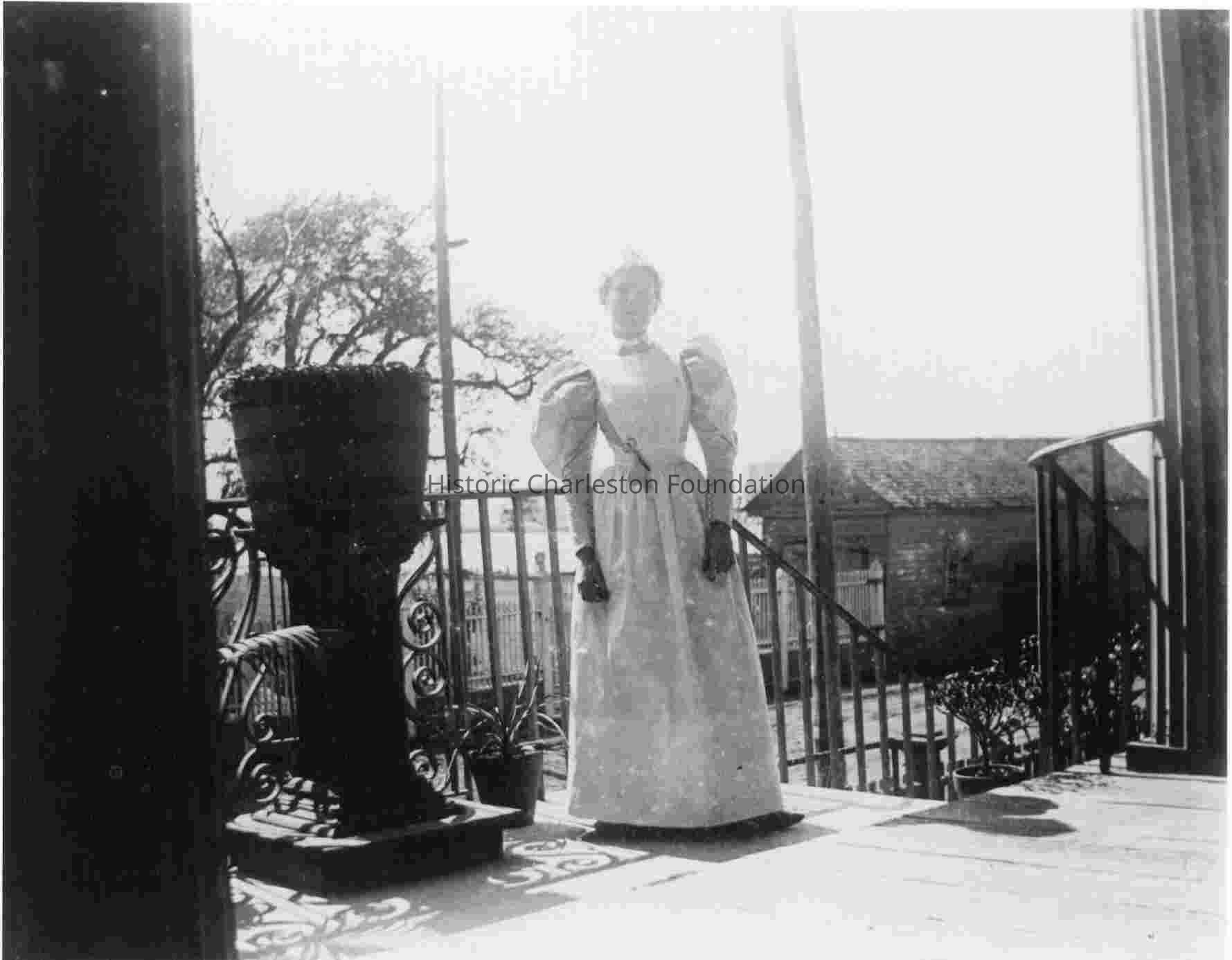 Woman standing by iron gate, presumably at the infirmary referred to in other photos, possibly 286 Calhoun Street (Jonathan Lucas House a/k/a Riverside Infirmary). Scissors is attached to her waistband. Levkoff identifies her as a nurse. Photo originally identified as Miss Jeanne Davis.Collection