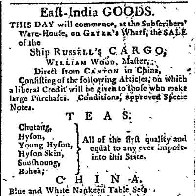 Charleston Gazette advertisement for Russell's warehouse, site where the fire originated (Aug. 1, 1797).