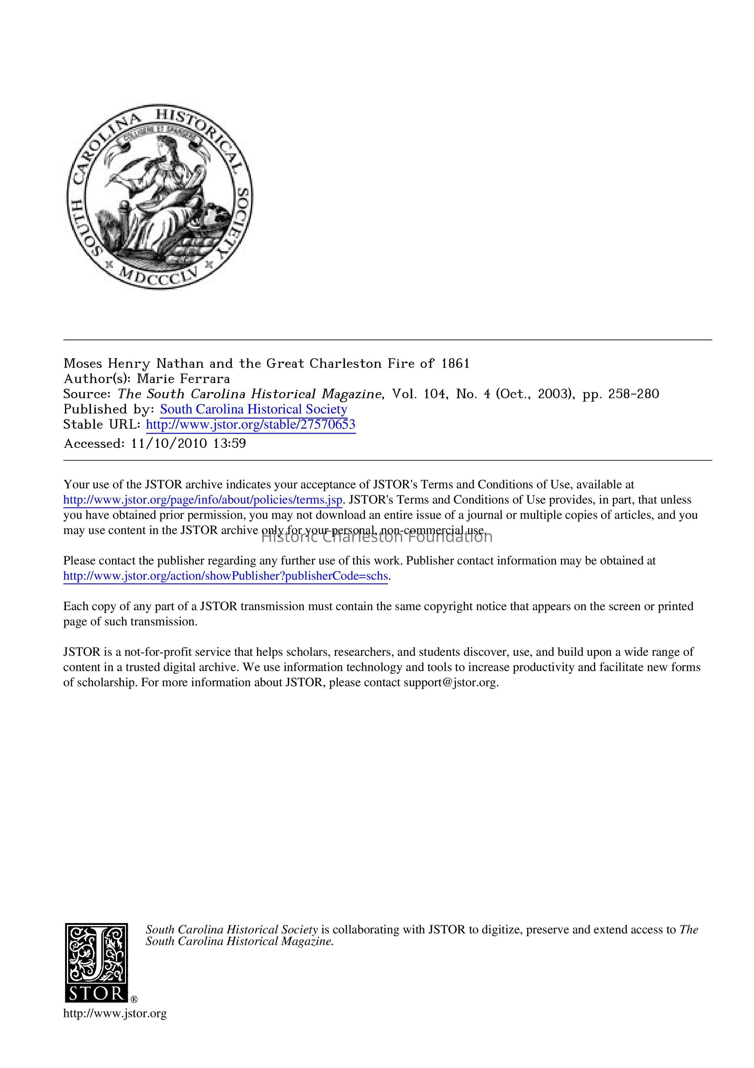 Moses Henry Nathan and the Great Charleston Fire of 1861Entry/Object ID
