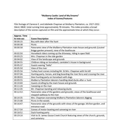 Silent film footage of Mr. and Mrs. Clarence E. Chapman (a New York financier and his wife Adelaide) and their time at Mulberry Castle a/k/a Mulberry Plantation, ca. 1926-1932. Includes scenes of the Chapmans, their guests, and their house employees. Features scenes of duck and deer hunting, picnicking, fishing, boating, and horseback riding.