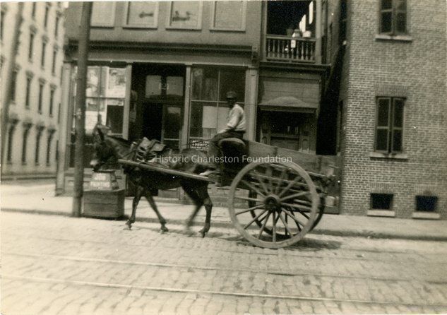 Photograph of a man driving a mule-drawn cart approaching the corner of Meeting and Queen, in front of the building located at 121 Meeting Street, at the northwest corner of Meeting and Queen. Signage for "Meyer Frank Printer" posted in window. Edge of the adjacent brick building at right. Edge of the Queen Street elevation of the Mills House Hotel at left.Collection