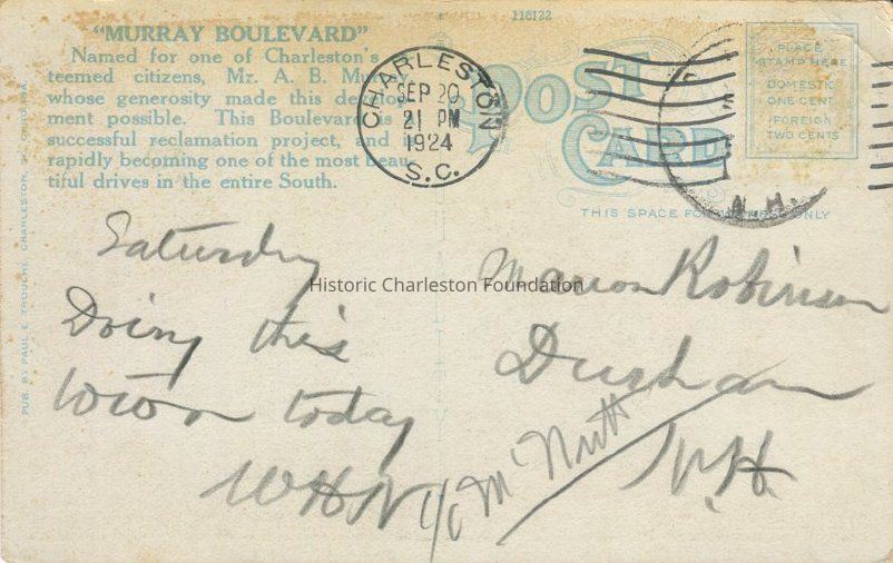 Back of postcard is postmarked September 20, 1924, and is captioned: "Named for one of Charleston's esteemed citizens, Mr. A.B. Murray, whose generosity made this development possible. This boulevard is a successful reclamation project, and is rapidly becoming one of the most beautiful drives in the country."