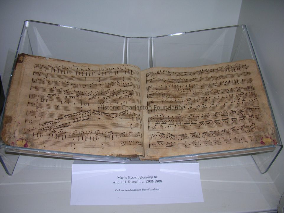 Book with cardboard ends with marbelized paper. It is printed with music lines that have been hand-scored. End papers have simple line drawings of a rectilinear design, a wheel, a pair of glasses (?) on a nose, a small curved object not unlike a wine siphon. Frontispiece signed, "Alicia H. Russell."