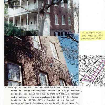 Photographs include (in original order): view from his fourth floor Ashley House apartment; views of the Ashley House; 64 Montagu; 60 Montagu; 54 Montagu; 91 Rutledge; 94 Rutledge; 40 Montagu; 40-C Montagu; 51 Smith; 29 Montagu; 24 Montagu; 21 Montagu; 20 Montagu; 35 Coming; 28 Pitt; 14 Montagu; 12 Montagu; 13 Montagu; 11 Montagu; 7 Montagu; 6 Montagu; 35 Coming; 40 Coming; 10 Bull; 18 Bull; 24 Bull; 32 Bull; 43 Bull; 48 Bull; 49 Bull; 52 Bull; 55 Bull; 56 Bull; 65 Bull; 70 Bull; 71 Bull; 76 Bull; 78 Bull; 81 Bull; 84 Bull; 107 Rutledge; 92 Bull; 96 Bull; 99 Bull; 100 Bull; 101-107 Bull; 104 Bull; 107 Ashley; 109 Ashley; 125 Bull; 128 Bull; 129 Bull; and 134 Bull. The "tour" ends at the Ashley House.Collection