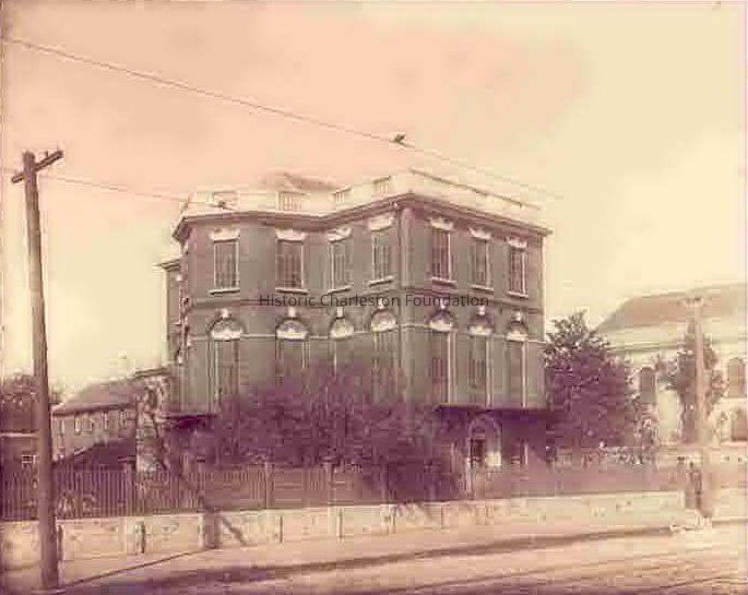 Street elevation of the Nathaniel Russell House (51 Meeting Street). East (front) and south sides of the house are visible, as well as outbuildings. Brick and picket(?) fence runs in front, along the sidewalk. Street is cobblestone, with trolley car tracks visible. South side of First (Scots) Presbyterian Church can also be seen.Photograph Details
