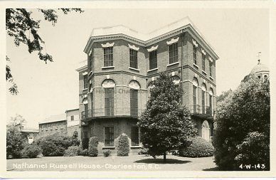 B&W photographic postcard featuring the south and east elevations of the Nathaniel Russell House. View taken from the lawn, with none of today's gardens evident. The cupola of First (Scots) Presbyterian Church is visible at the right.Collection