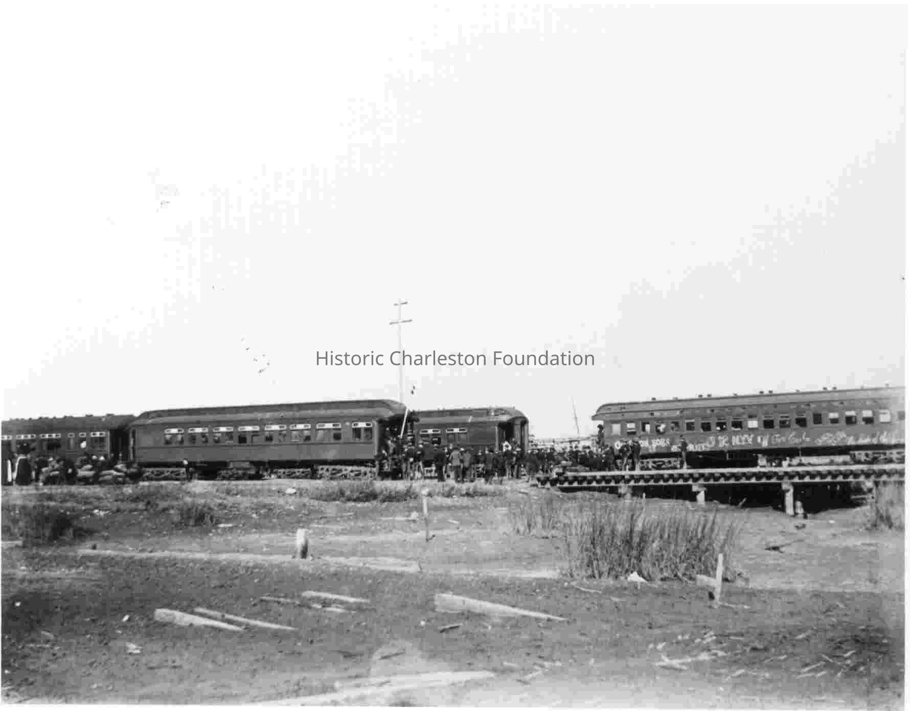 Photo is identified as New York volunteers (Spanish-American War) on railroad cars, which appears to be painted on the side of one of the cars. Many individuals are standing by the tracks; some are boarding the train.Collection