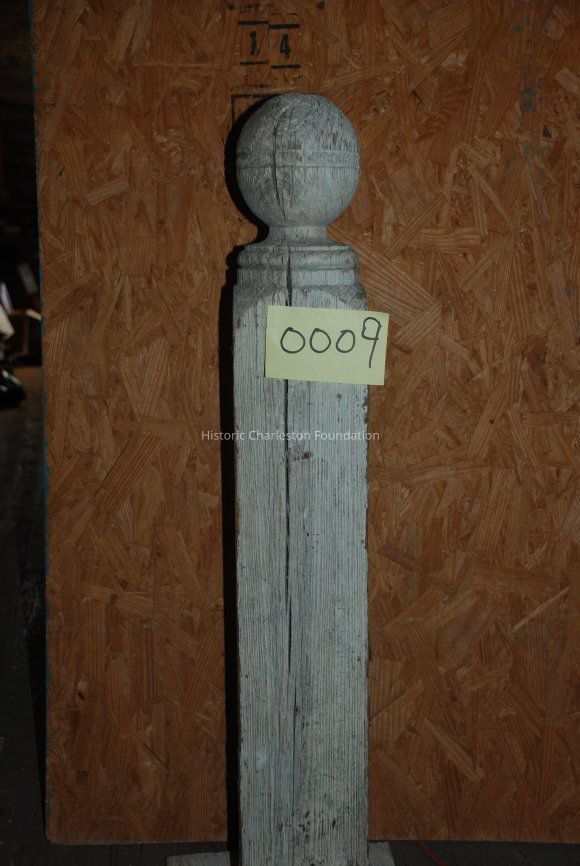 Wood newel post, ca. 1790-1875. White paint; square base with sphere on top. Exterior newel piece.Collection